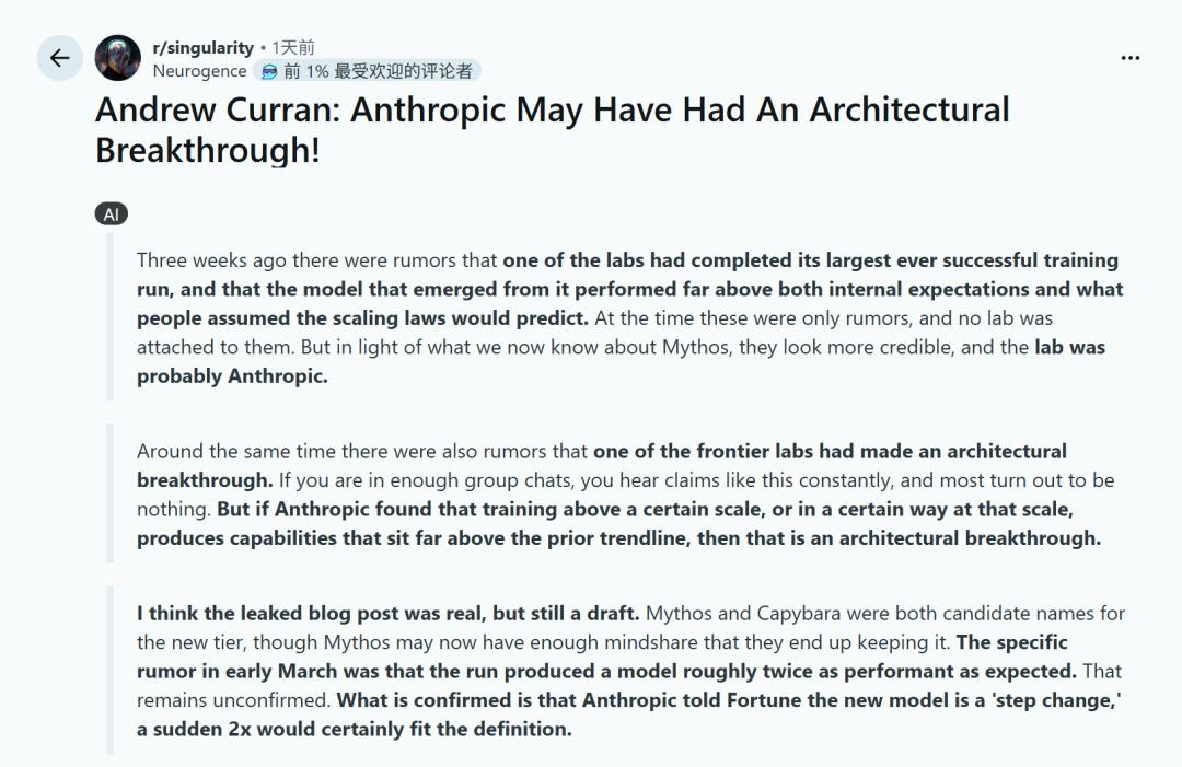 在相关主题的Reddit帖子中,网友们争论的核心就在于:这次Claude 5.0的进步,到底是堆算力的结果,还是架构的革命?