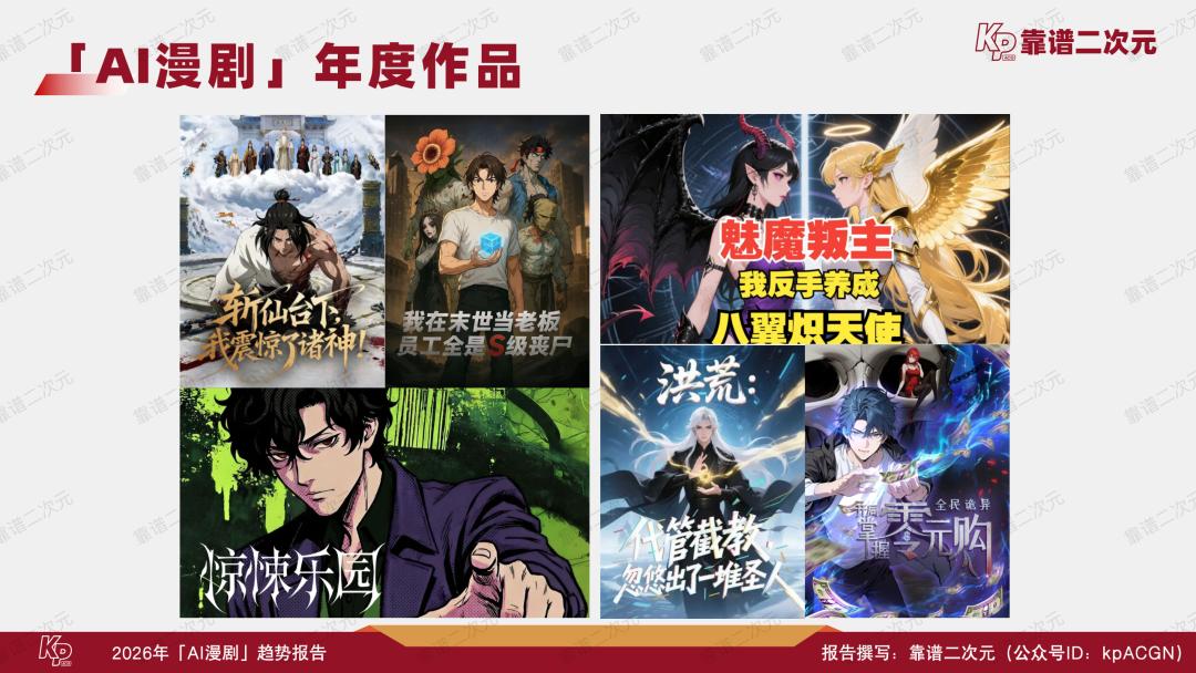 播放量破10亿的AI漫剧《斩仙台下,我震惊了诸神》,以西游封神为底本二创;末世题材与系统流爽文的经典结合,《我在末世当老板,员工全是S级丧尸》让末世题材成为破圈AI漫剧热门题材;《洪荒:代管截教,忽悠出了一堆圣人》是酱油文化全面转型漫剧的开山之作,证明头部制作公司跑通AI漫剧商业闭环;诡异题材与系统流玩法结合的典型爆款《全民诡异:开局掌握零元购》;阅文集团与酱油动漫深度合作的首部现象级作品《魅魔叛主,我反手养成八翼炽天使》,成为IP方与制作方协同出品模式可行性的重要验证;作为2026年漫剧精品化升级的先行样本,《惊悚乐园》是漫剧赛道从流量导向转向内容导向的重要信号。