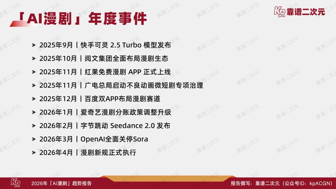 随着头部内容厂牌、头部AI漫剧作品、领先的工具提供商和占据流量优势地位的平台出现,AI漫剧的格局从此前的分散竞争,正在步入初步集中化。在过去的一年里,众多事件影响了产业的方向,加速了AI漫剧的发展。