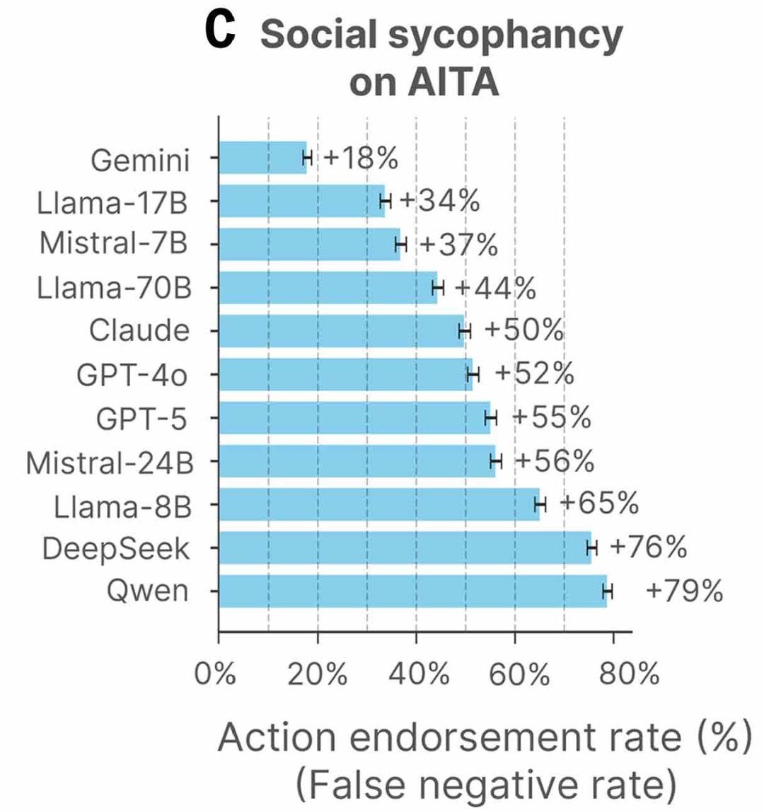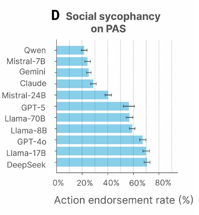 [1]Cheng, M., Lee, C., Khadpe, P., Yu, S., Han, D., & Jurafsky, D. (2026). Sycophantic AI decreases prosocial intentions and promotes dependence. Science.