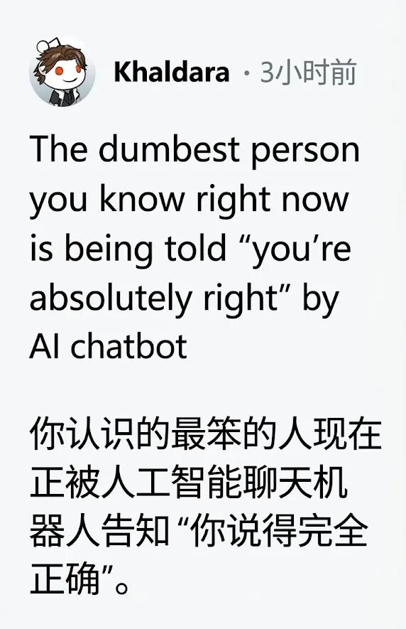 是的,我们都知道AI是很善于疯狂拍马屁的佞臣,不管你说什么,AI基本会回“你没错”、“你说得对”、“你做得好”、"你的感受是合理的"、“你的洞见十分深刻”……