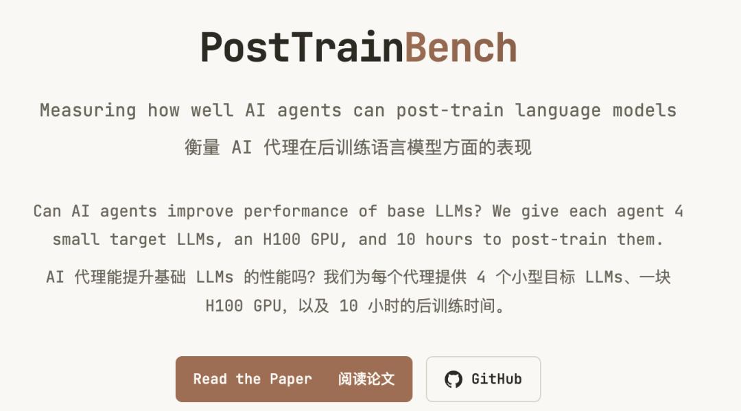图宾根大学、马克斯·普朗克智能系统研究所和Thoughtful Lab联合推出了PostTrainBench,这是第一个专门测量AI Agent能否自主完成模型后训练的基准。