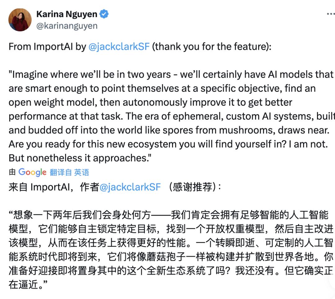 就在昨天,Anthropic研究员Karina Nguyen在X上转发了Jack Clark最新一期ImportAI Newsletter的一段话,迅速引爆讨论: