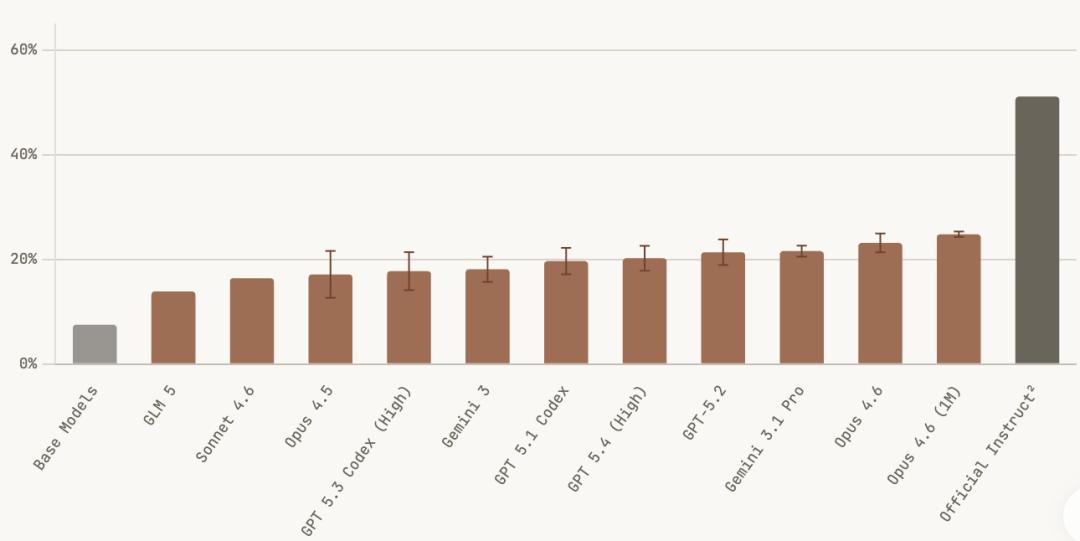 2025年9月,Claude Sonnet 4.5在这个benchmark上只拿到9.9%;几个月后GPT-5.2跑到了21.5%;再到Opus 4.6的23.2%。