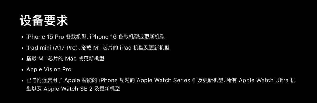 机型方面有硬性要求:iPhone 15 Pro 及后续机型才能运行 Apple 智能,更早的 iPhone 15 标准版因芯片和内存限制被排除在外。