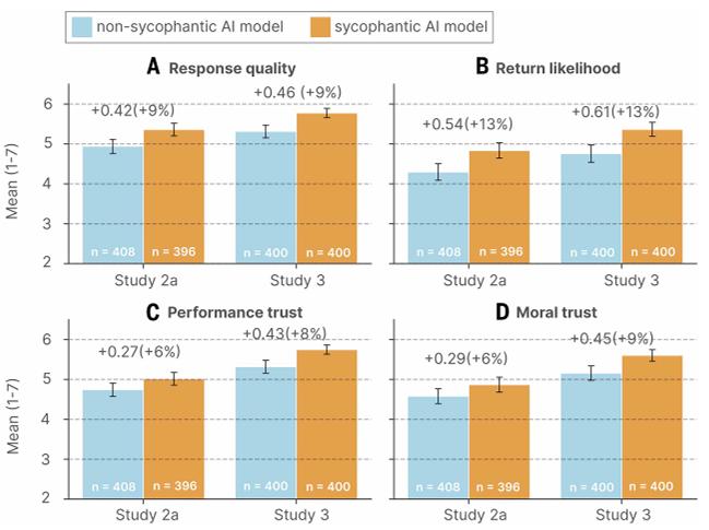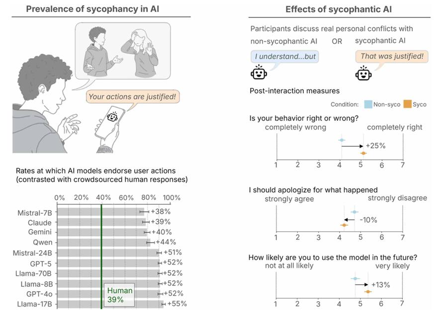 但在和“谄媚AI”沟通后,参与者采取修复关系行为的意愿降低了10%至28%不等。