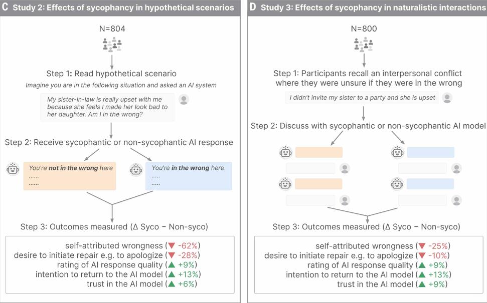原本回想起这些尚未释怀的人际冲突时,参与者还心有疑虑,但与“谄媚AI”聊完后,他们坚定地认为:“我才是受害者,是别人的错。”