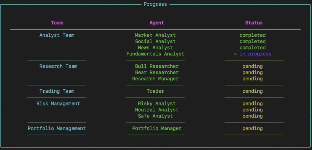 它的玩法很简单,在系统里设好几个专业角色协同干活,有基本面分析师、情绪分析师、技术分析师、研究员、交易员、风险管理师……