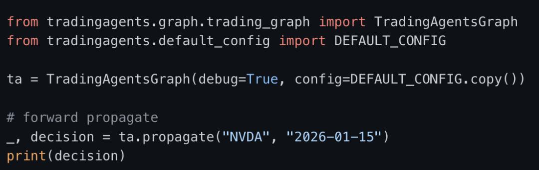 三行核心代码,propagate()直接返回决策结果,辩论轮数、LLM选择这些参数都能在配置文件里随便调。