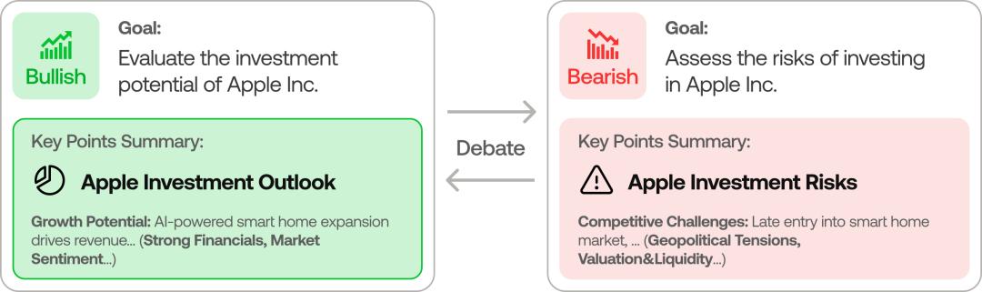 研究团队专门设了多头研究员和空头研究员两个对立角色,一个看涨,一个看跌,对着同一份资产正式开辩。