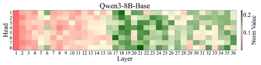 上图展示了Qwen3-8B所有层和KV头的相关性敏感度。绿色区域(高ℓ₂距离)集中在中后层的特定头上,与近期机制分析中发现的“检索头”分布高度吻合。SEKA正是利用这一发现,仅对这些敏感的KV头施加引导,避免干扰其他功能头——消融实验也证实,去掉这一筛选机制会导致性能大幅下降。