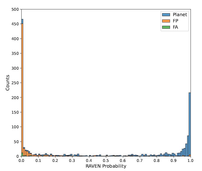 RAVEN 流程性能最终在一组已有先验分类的 TOIs 上进行了测试。对于样本中所有 1,361 个 TOI,其 RAVEN 概率下图所示: