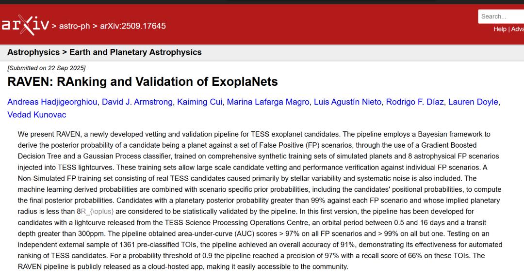 相关研究成果以「RAVEN: RAnking and Validation of ExoplaNets」为题,已发布预印本于 arXiv。