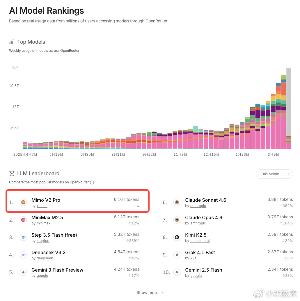 具体来看,MiMo-V2-Pro 最近一周 token 消耗量突破 4 万亿,蝉联周榜第一。最新月榜数据显示,MiMo-V2-Pro 上线不到半个月时间,累计 Token 消耗量已超 6 万亿,成为新晋月榜第一大模型。