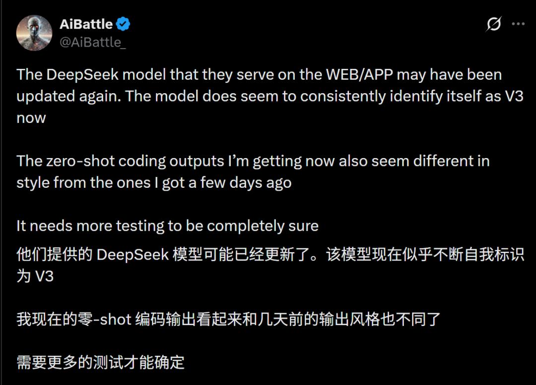 虽然在对话框中,它依然谦虚地自称「V3」,但那种底层逻辑的敏锐感,大概率不是微调能带来的。