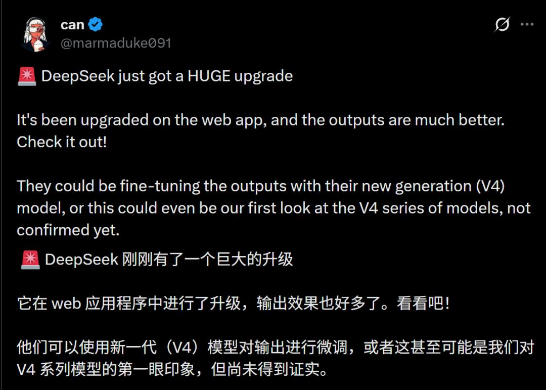 很有可能,V4的部分能力(或者是经过V4蒸馏后的版本)已经替换现有的V3接口,但标签还没改过来。用AI圈的术语来讲,这叫做「隐形进化」。
