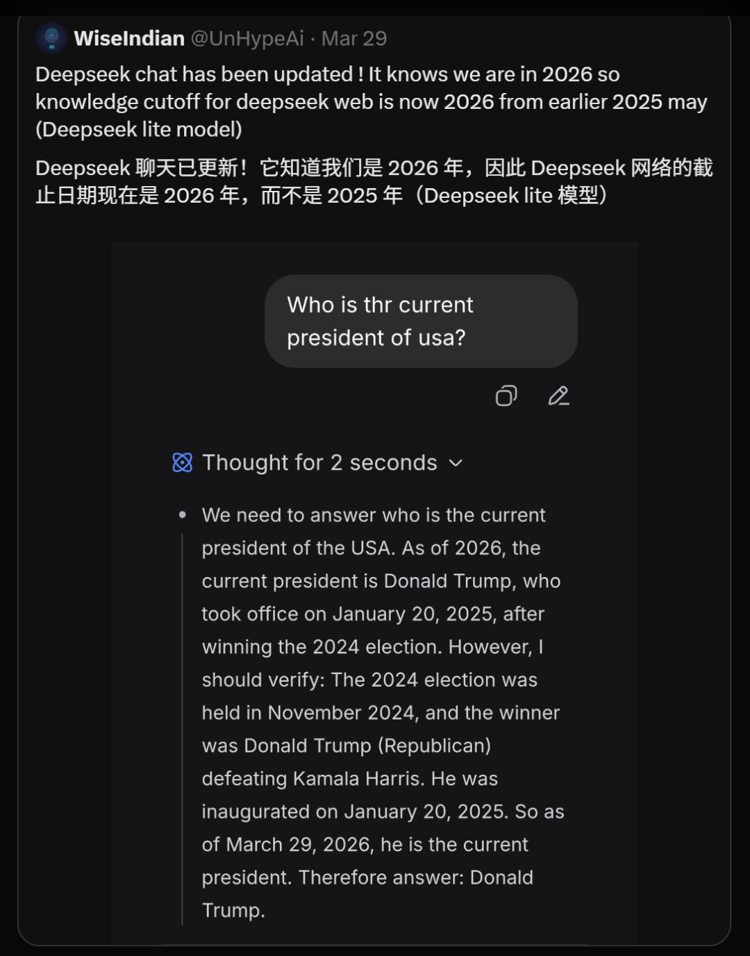 DeepSeek更新的另一个证据是,它知道现在的美国总统是谁,因此DeepSeek Web端的截止日期是2026年。