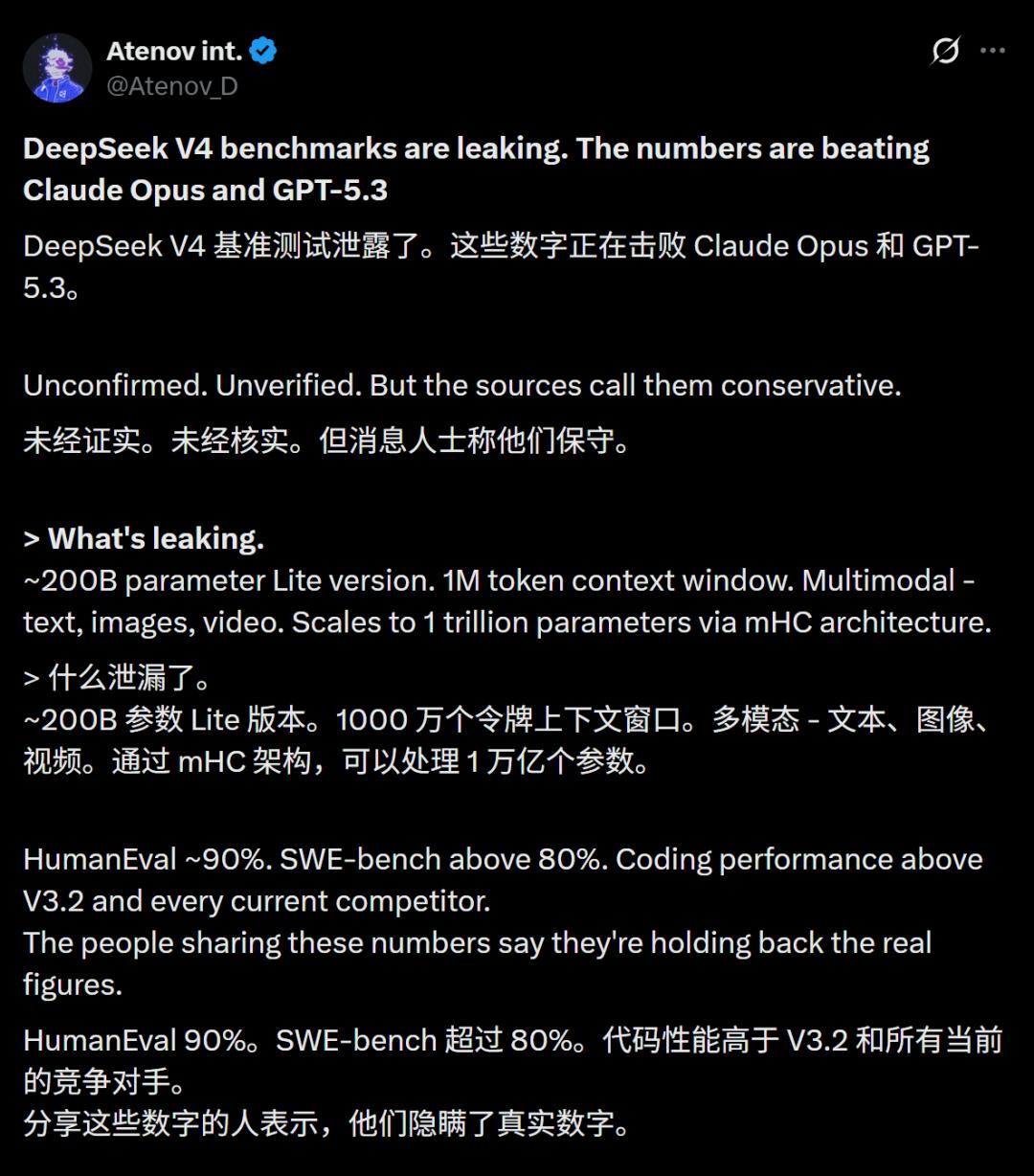 近期,圈内开始流传一组「DeepSeek V4基准数据」,虽然未经官方确认,但信息量极大——
