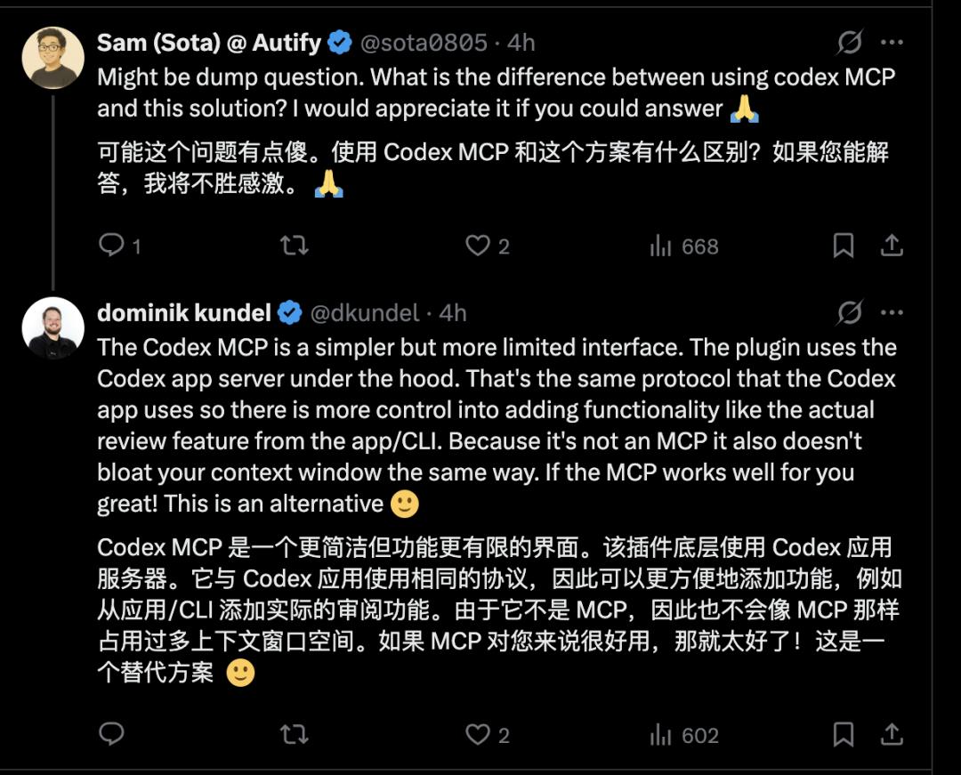Dominik 在评论区回复该用户时解答道:“Codex MCP 是一个更简洁但功能更有限的界面。该插件底层使用 Codex 应用服务器。它与 Codex 应用使用相同的协议,因此可以更方便地添加功能,例如从应用 /CLI 添加实际的审阅功能。由于它不是 MCP,因此也不会像 MCP 那样占用过多上下文窗口空间。如果 MCP 对您来说很好用,那就太好了!这是一个替代方案。”