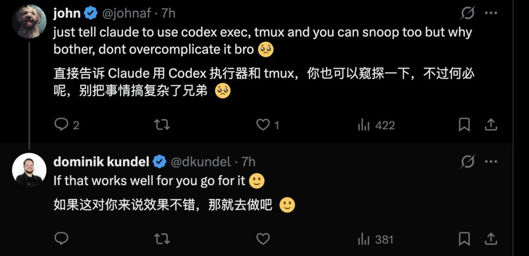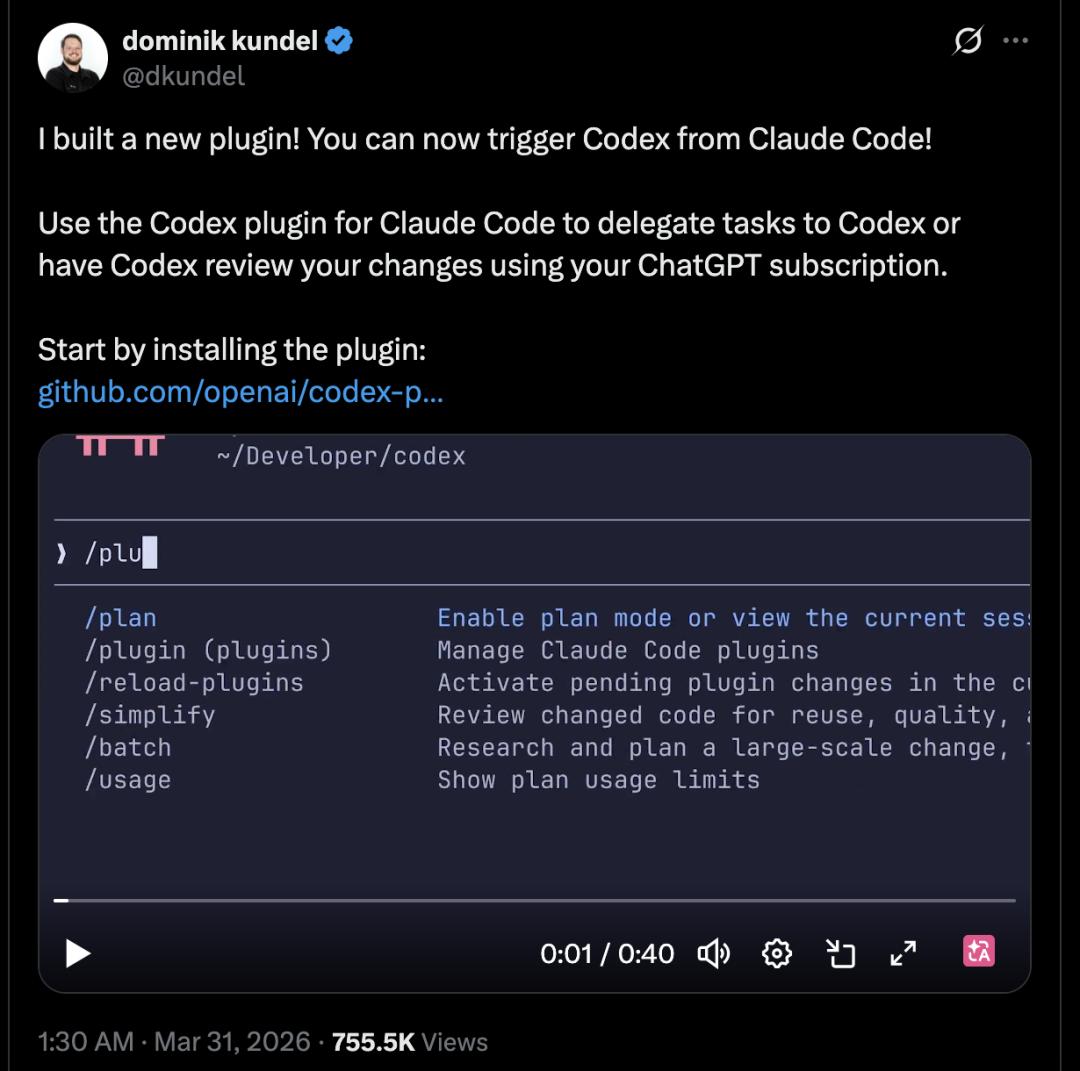 OpenAI 推出的新插件,在 X 上引发了用户的广泛讨论。有用户表示,“直接告诉 Claude 用 Codex 执行器和 tmux,也是可以达到这种效果的,何必多此一举。”
