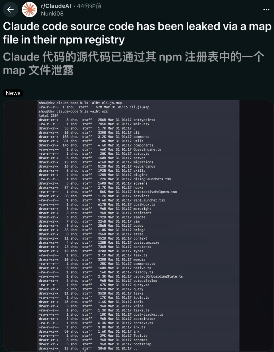 Claude Code源代码通过npm注册表中的一个map文件惨遭泄露,全部在线裸奔。
