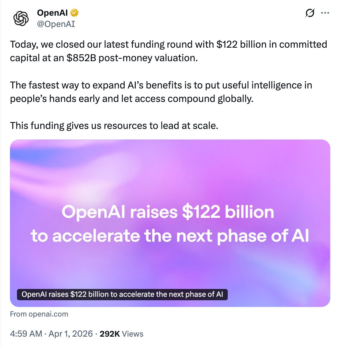智东西4月1日消息,今早,OpenAI宣布完成了最新一轮融资,募集资金达1220亿美元(约合人民币8416.78亿元),投后估值达8520亿美元(约合人民币58779.48亿元),成为全球有史以来规模最大的单笔私募股权融资。