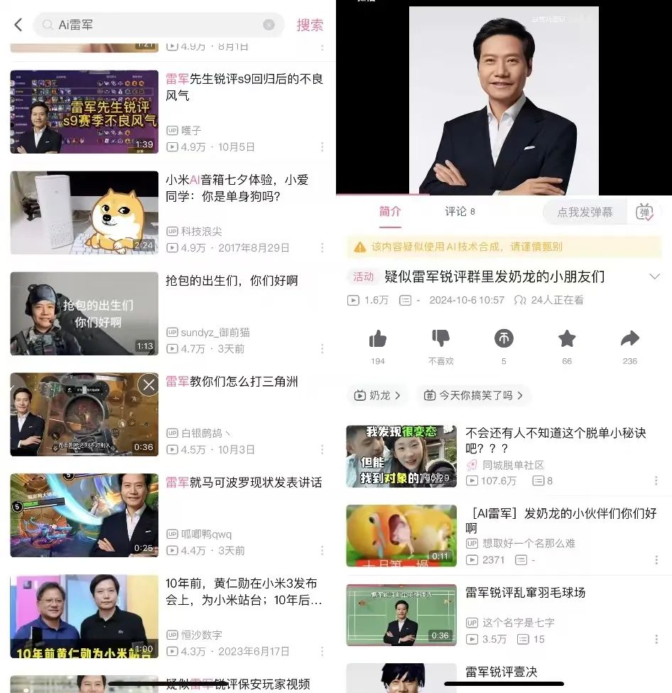 打游戏不顺心时,国庆堵车时,假期结束时,网友:AI雷军。打开视频网站,清一色标题“雷军锐评”,带上ai雷军的tag,视频0帧起手,直抒胸臆,一口一个老子、畜生,一阵鸟语花香过后,以“远程遥控小米su7创死xx”、“远程遥控小米手机死机自爆”等威胁结束。AI雷军语气温和但脏话不断,与本人形成强烈的反差。