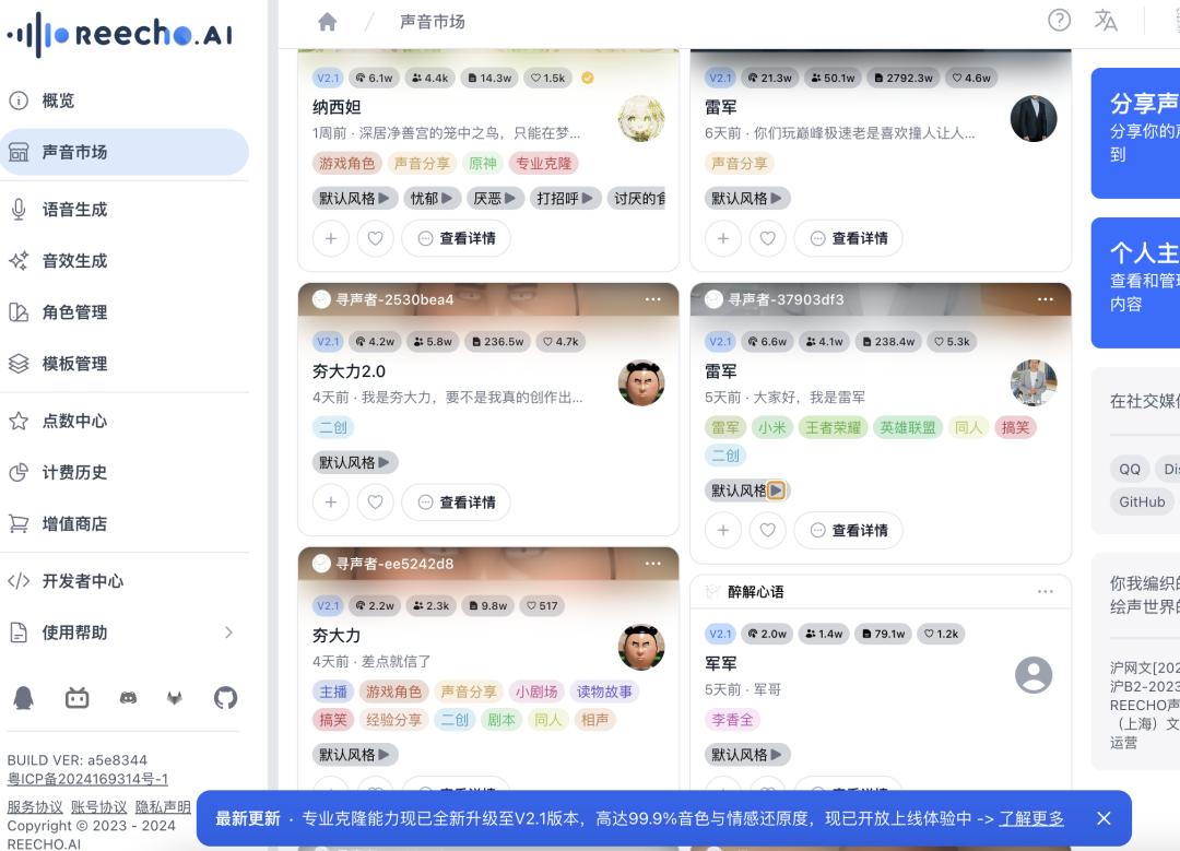 AI雷军爆火后,言域科技表示,正在配合小米予以处理。但AI鲸选社发现,事发多天后,雷军的克隆声纹仍在“睿声”声音市场的首页,占据多个推荐位。