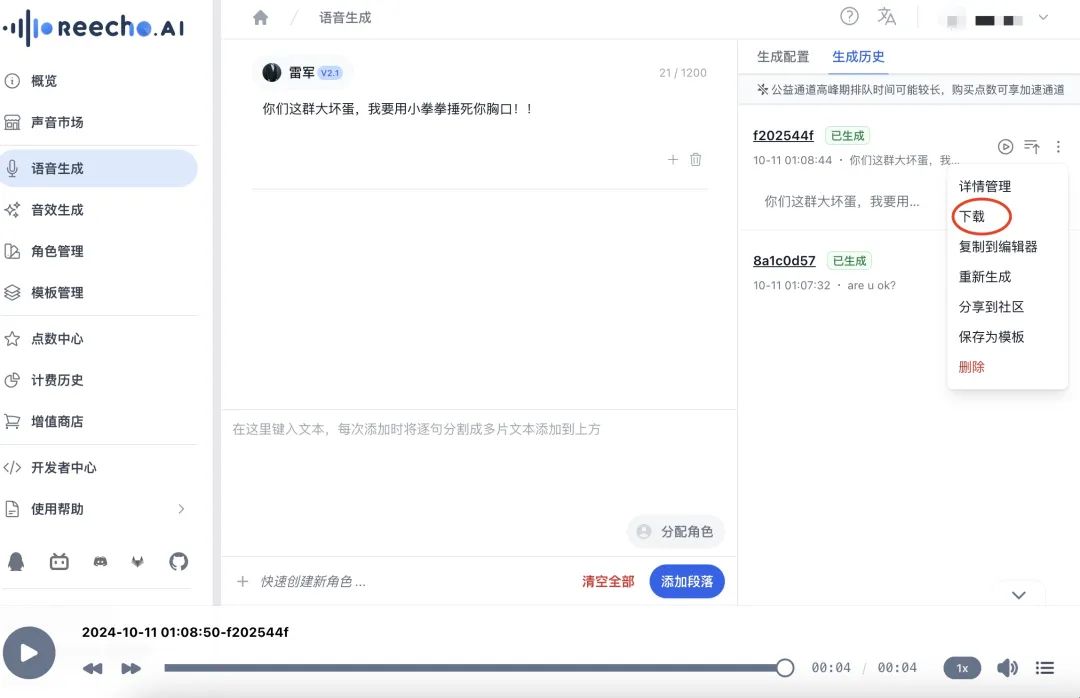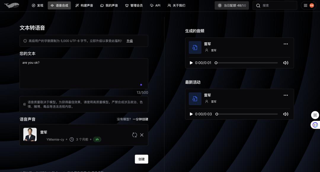 在鲸妹试用AI配音软件生成的音频时,也被AI雷军“锤死你胸口”的猎奇感所吸引,情不自禁地陷入了“那这个声音说出这句话会是什么样”的圈套之中,留恋了一小时有余。