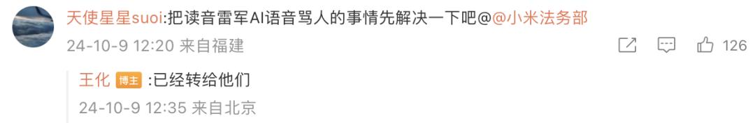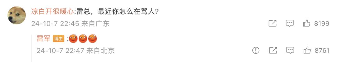 于是在最近,有人在雷军的微博下评论:“雷总,你最近怎么总在骂人?”,雷军对此回复了三个“愤怒”的表情。隔天小米公关总经理王化便表示已经将AI骂人交给法务部处理。