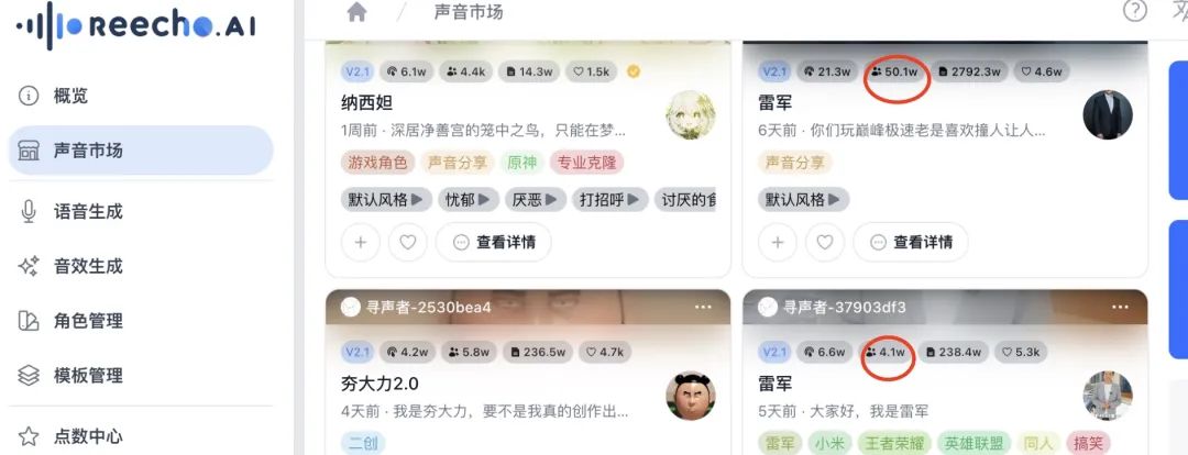 一般用户想用名人的声音,许多小程序经过简单的检索就可以直接实现语音生成。据了解,如配音兔小程序中也有雷军的AI声纹,但因权限问题,被改名成“雷老板”,但也未能逃避公关团队的法眼,目前已下架。而许多配音软件,如Reecho睿声,则是直接标注“雷军”,并在主页进行推荐。