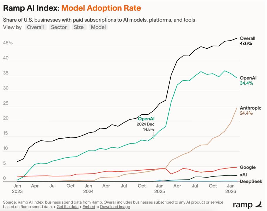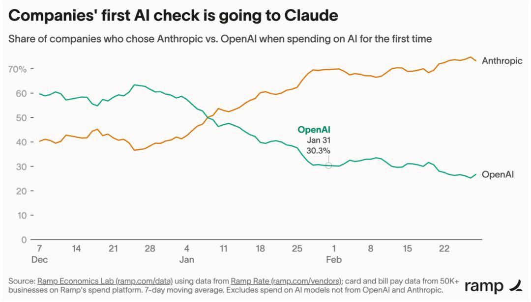 同样来自Ramp:买AI的新企业客户中,选择Anthropic的已经占到70%,已经是OpenAI的两倍多了,而这个超越的过程就发生在过去一个多月里。