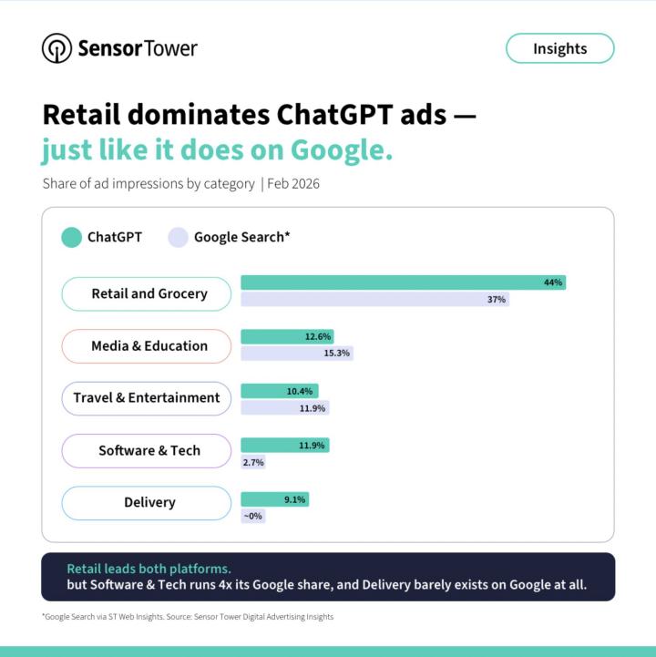 根据Sensor Tower的监测数据——两周内100+品牌在ChatGPT投放广告。