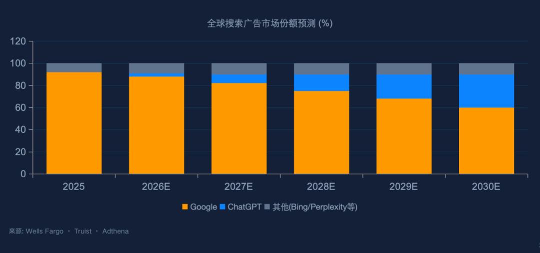 根据富国银行分析师Ken Gawrelski的预测:2030年ChatGPT能占据全球搜索广告30%。