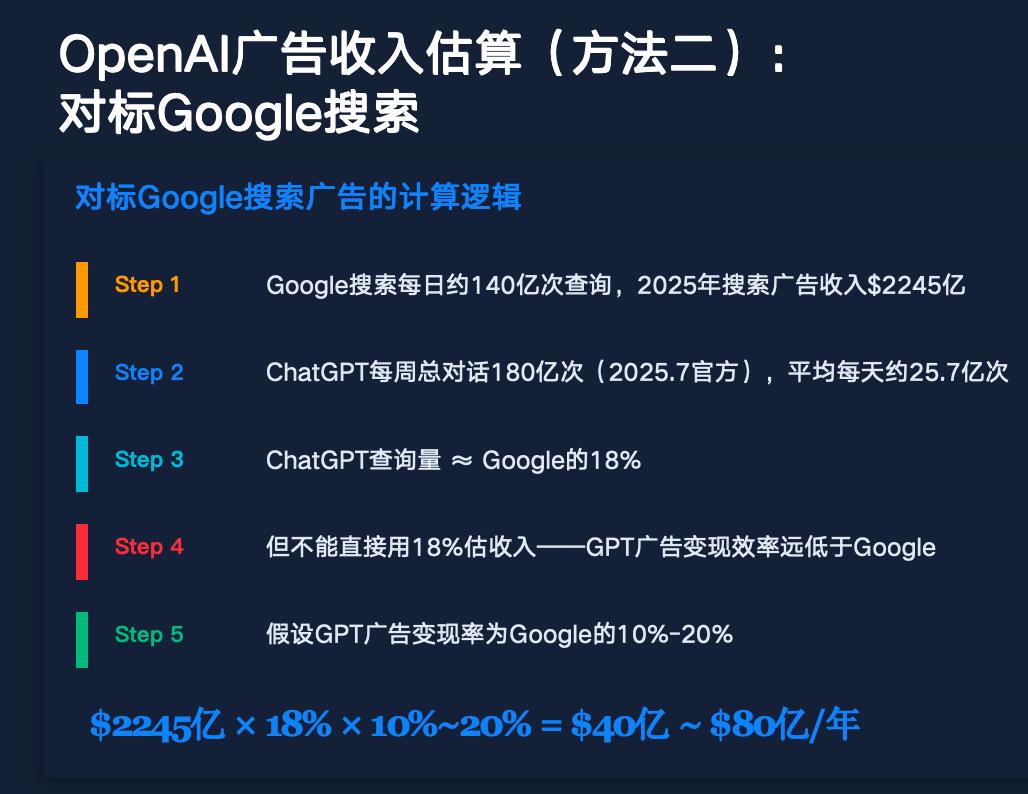 两种方法的估算没有数量级上的差异:结论就是OpenAI第一年的广告收入大概率在$20-80亿/年。