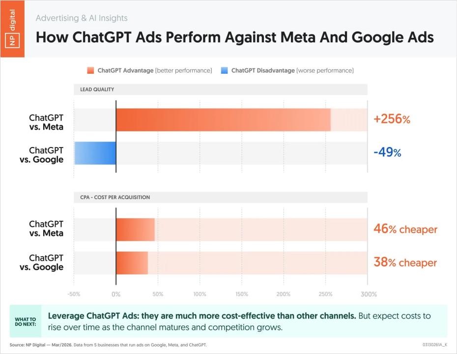 GPT线索质量比Meta高出256%,但比 Google低49%;