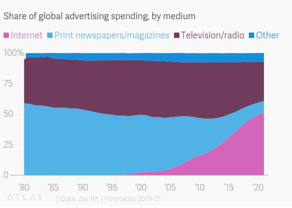 互联网从2009年的13%上升到了2018年的51%,而互联网也正好占据了人们51%的时间。(尽管这些数据不是最新的,但广告收入和时长匹配的大逻辑是清晰的)