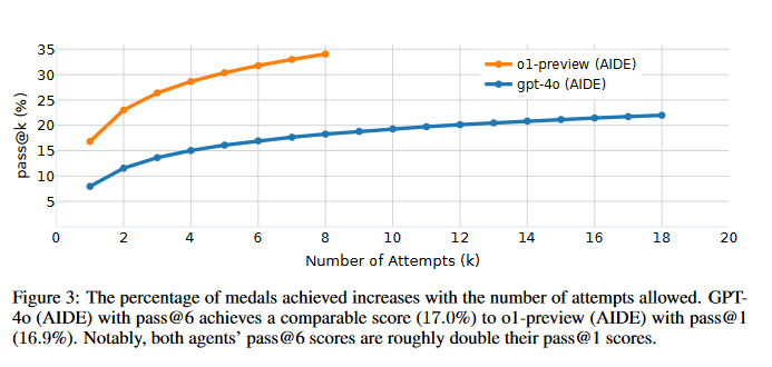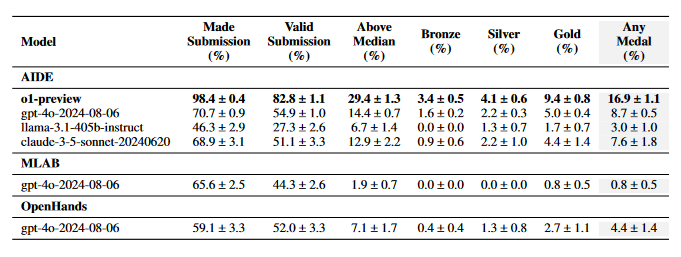 OpenAI 在 MLE-bench 上测试了多个 AI 模型和智能体框架,使用 AIDE 框架的 o1-preview 模型表现最佳,在 16.9% 的比赛中至少获得了一枚铜牌,该结果超越了 Anthropic 的 Claude 3.5 Sonnet。