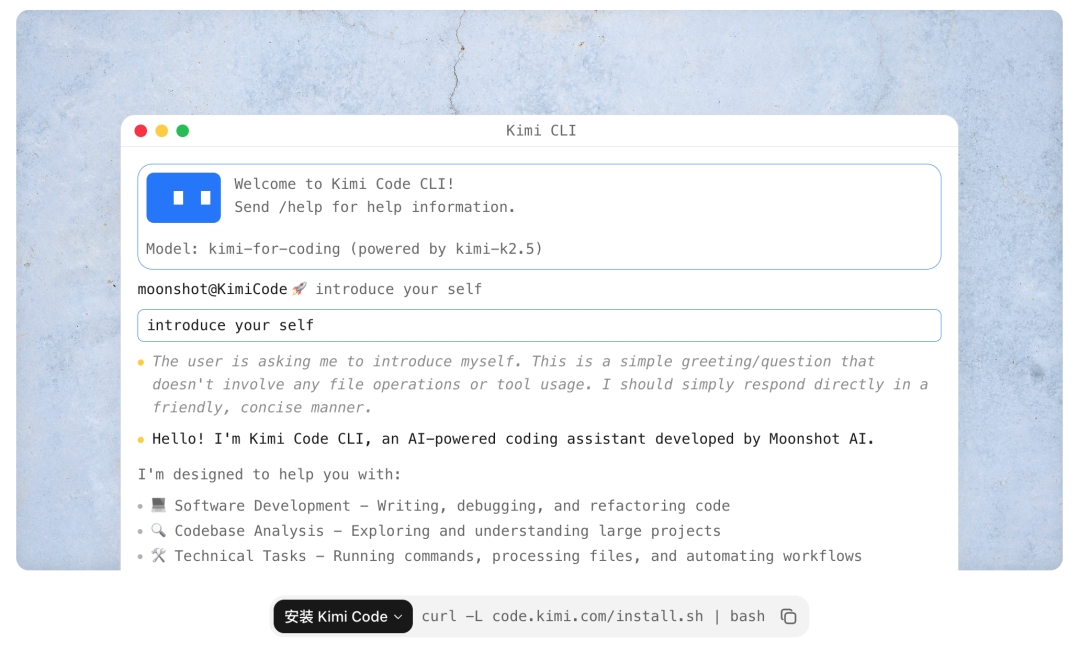 它从一开始就不只是一个 coding agent,而是运行在命令行界面的 Kimi 智能助理,人们应该期待它可以做任何事,以命令行界面的形式。