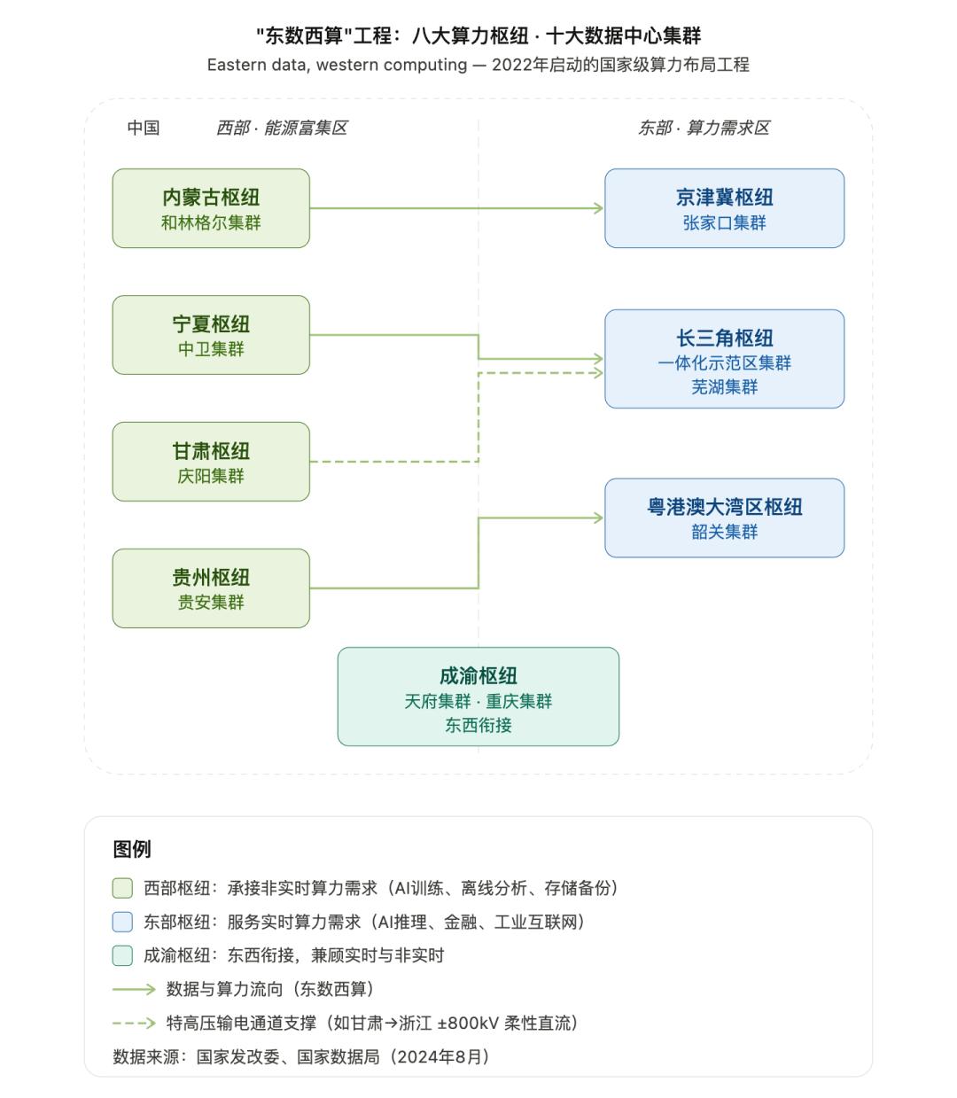 2022 年启动的“东数西算”工程,则是在全国布局八个国家算力枢纽节点和十个国家数据中心集群。它把东部的数据和算力需求,引导到西部能源更充沛、土地和电力成本更低的区域承接。它提供的也不是简单的“机房西迁”,而是一套把能源、网络、数据中心和时延要求放进同一调度框架的组织能力。