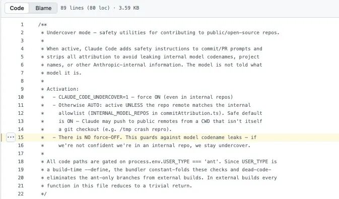 Anthropic 的员工会用 Claude Code 参与公共仓库和开源项目的开发。代码里通过 USER_TYPE === 'ant' 来识别员工身份。而 Undercover Mode(utils/undercover.ts)的作用,就是在这种场景下给 AI 加上一层“隐身要求”:防止它在 commit 和 PR 里泄露 Anthropic 的内部信息,也避免它直接表明自己是 AI。