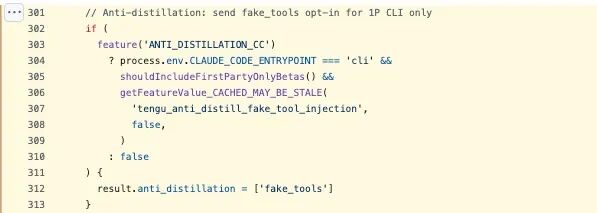 在 claude.ts(301–313 行)里,有一个名为 ANTI_DISTILLATION_CC 的开关。打开之后,Claude Code 在发起 API 请求时,会带上 anti_distillation: ['fake_tools']。这意味着服务端会悄悄往 system prompt 里塞进一些伪造出来的工具定义。