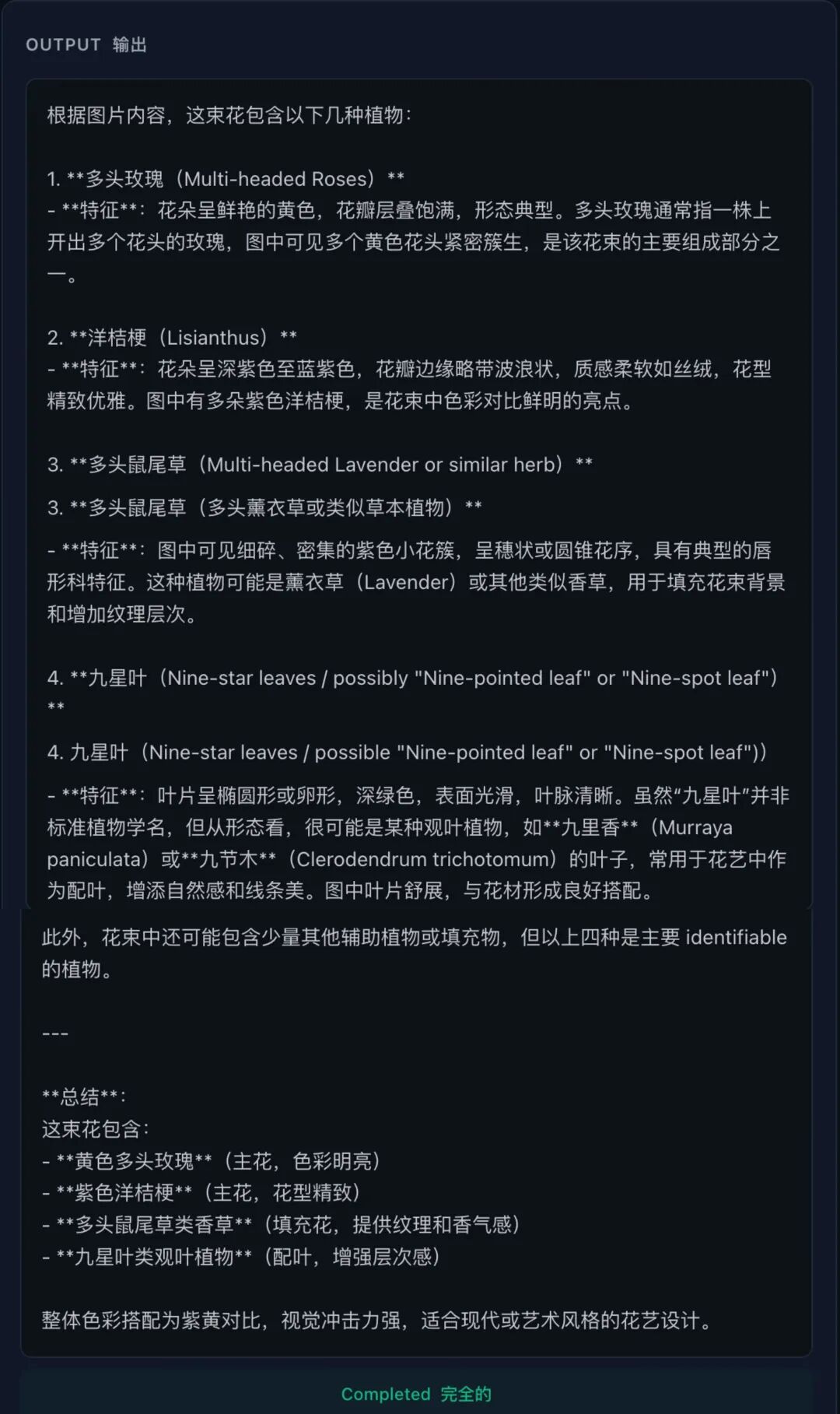 模型准确辨别出黄色多头玫瑰、紫色洋桔梗、鼠尾草类香草及配叶植物,并对各自颜色、形态给出较为细致描述,还主动补充花束整体配色风格的分析。