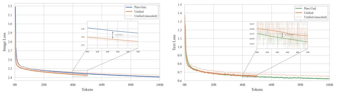 在同等 token 数量的训练下,统一模型(Unified model)的损失与纯理解模型(Pure-Und.)的差距微乎其微(仅相差 0.006) ,同时其损失甚至比纯生成模型(Pure-Gen.)还要低 0.02 。