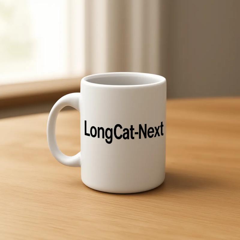 prompt: A white mug on a wooden table with "LongCat-Next" printed on it in clean font. Simple background, morning light from a window, minimalist product photography.