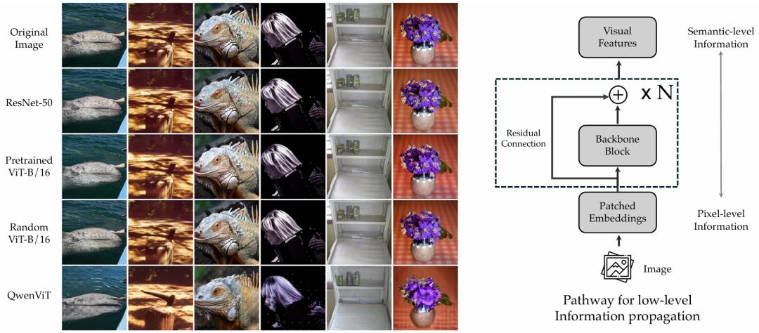 在将图像转换为 token 的过程中,研究人员观察到一个内在的信息保留现象:即使视觉编码器没有接受像素级重建训练,只要其结构中包含残差连接,就会自然保留一条低层信号传播路径。
