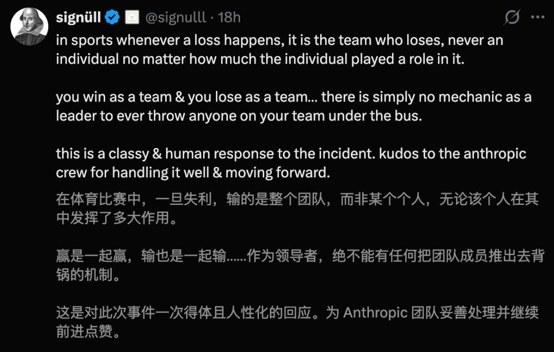 针对这次事件,这番回应既有格局也很有人情味,给 Anthropic团队点个赞。