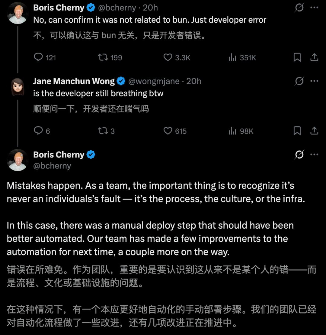 人为+基础设施失误,和AI无关,和Bun漏洞无关。