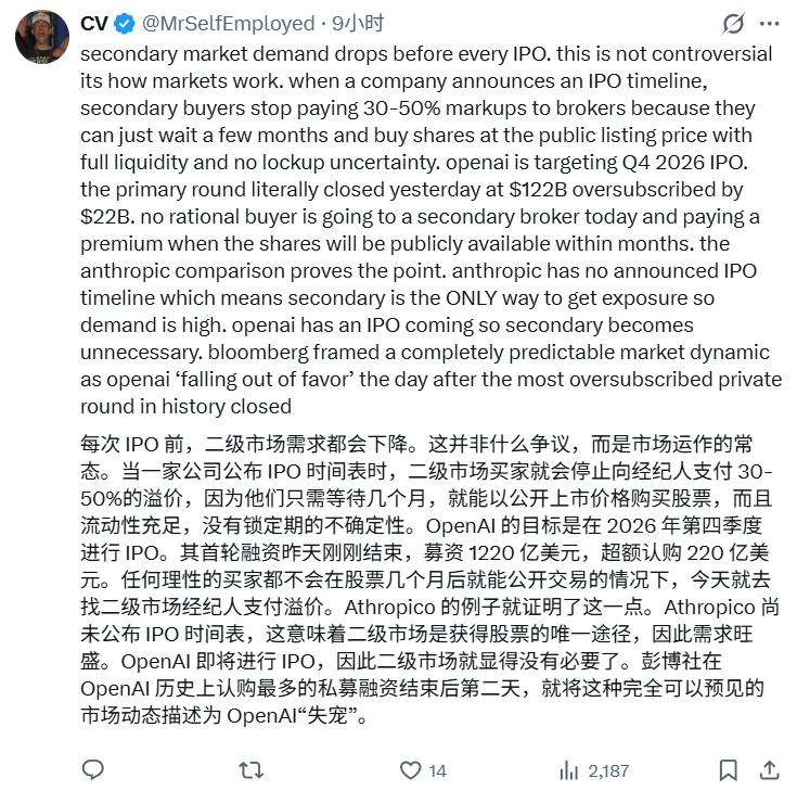 另一类更偏市场视角的解释则更「冷静」:如果 OpenAI 的 IPO 已有明确时间预期(例如 2026 年),那么理性的投资者自然会减少在二级市场以高溢价买入的动力,转而等待公开市场直接参与。相比之下,Anthropic 尚未给出清晰的上市路径,二级市场几乎是唯一入口,需求自然更集中。