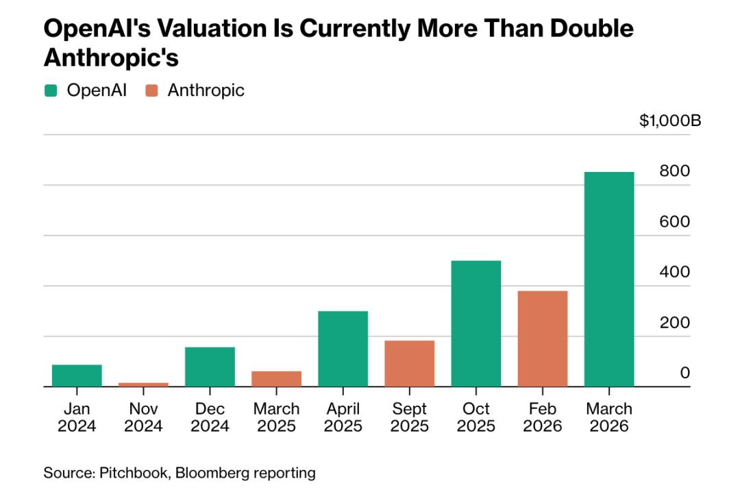 OpenAI 整体估值已是 Anthropic 的两倍以上